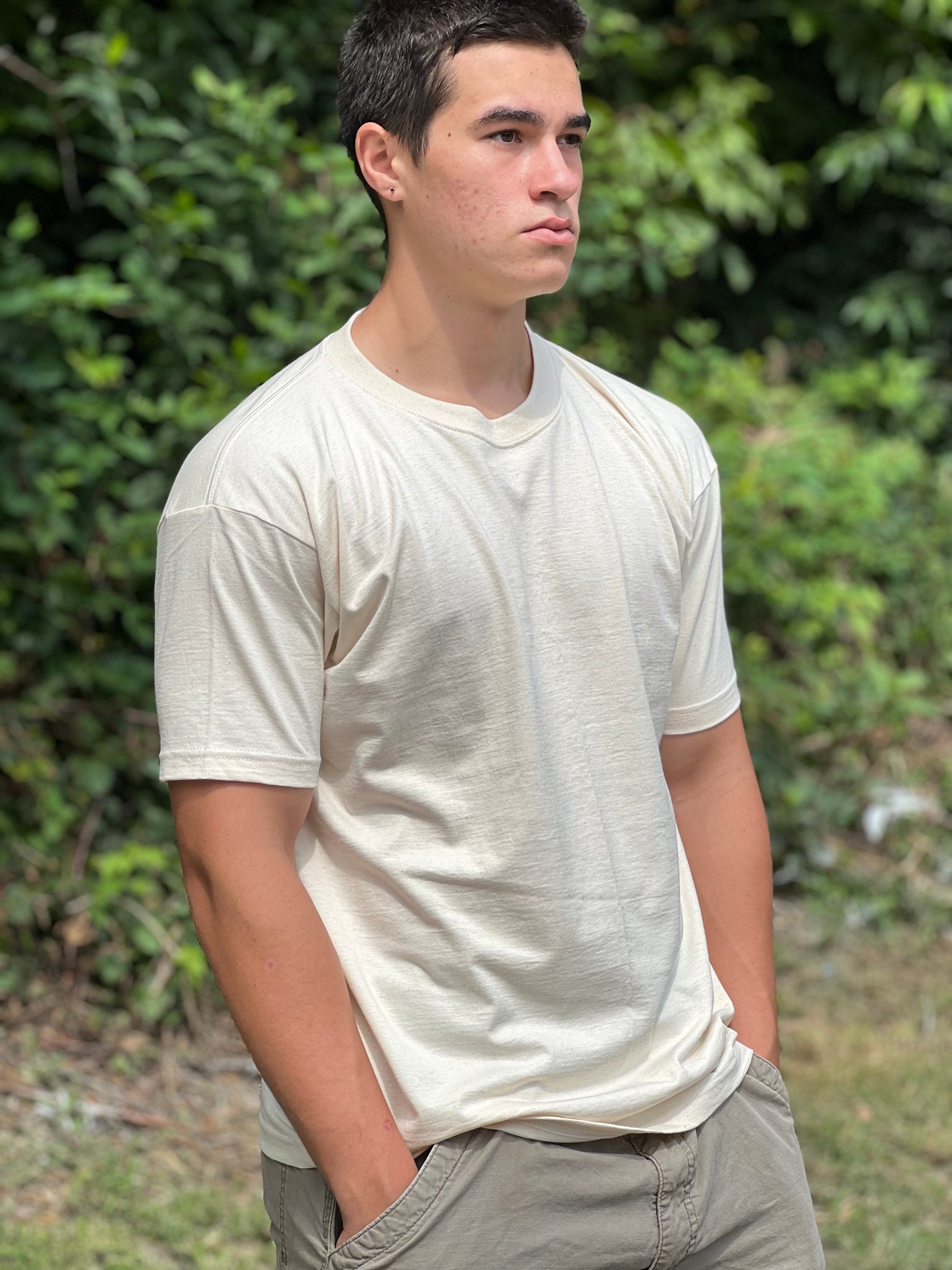 Crafted from 100% American-grown organic cotton, our Natural Organic T-shirt exemplifies refined simplicity. Featuring a meticulously double-stitched neckline and entirely free of dyes or bleach, this short-sleeve, vintage-inspired piece offers both elegance and comfort. Proudly produced in the USA, each shirt is thoughtfully spun, sewn, and shipped to uphold the highest standards of quality and sustainability.